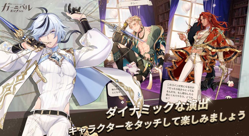 『NU: カーニバル – Bliss』は、異世界に転生した主人公が「眷属」たちと協力して世界を救う育成BLスマホゲームです。