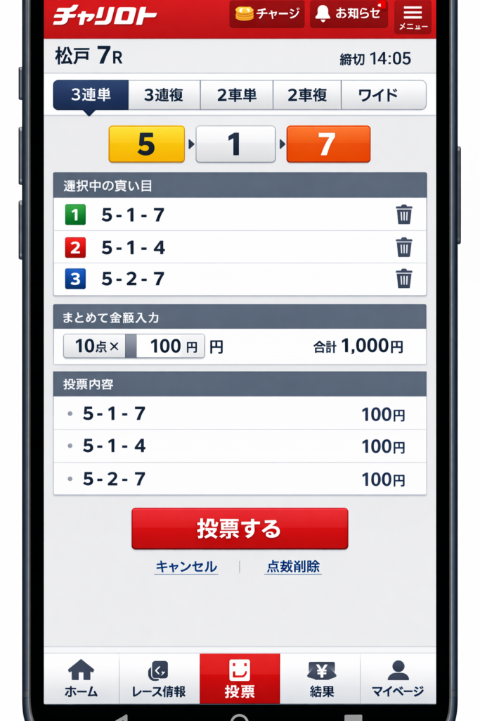 投票方法は「単勝」「複勝」「三連単」など定番から、チャリロト独自のBIG的な大口配当狙いまで豊富。