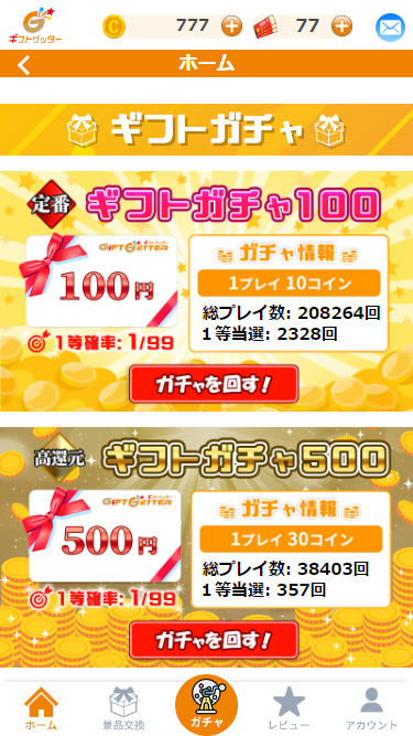 ギフトゲッターギフトゲッターは、広告案件などを利用してポイントを貯め、そのポイントでガチャを回してギフト券などが当たるポイ活サービスです。